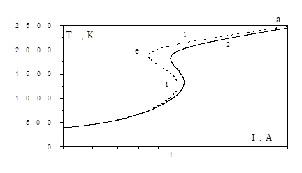 Зажигание проволочки силой тока, значение которой лежит в интервале Ie <I<Ii происходит, если ее начальная температура выше значения, лежащего на кривой, соединяющей т.i и e для соответствующего значения I. Таким образом, наблюдается гистерезисное поведение температуры проволочки в зависимости от силы тока, нагревающего ее. Область гистерезиса ограничивается критическими значениями Ii и Ie . Эти состояния неустойчивые и определяют переходы с низкотемпературного состояния в высокотемпературное и наоборот. При значениях силы тока I<Ie зажигание проволочки невозможно ни при каких значениях ее начальной температуры.
