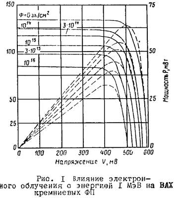 Уменьшение тока короткого замыкания при радиационном воздействии приводит к смещению рабочей точки ВАХ ФП в сторону меньшего значения максимальной мощности, что соответствует снижению КПД и выходной мощности.