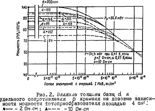 Радиационную устойчивость можно увеличить оптимальным выбором структурных параметров ФП. Прежде всего толщины, как показано на рисунке 2.[5] Приведенные данные получены для ФП со структурой p±n.