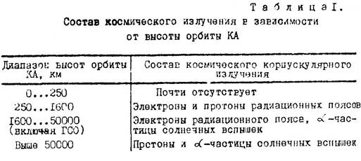 В 50-е годы в космическом пространстве установлено наличие потоков заряженных частиц (электронов, протонов, α-частиц), захваченных магнитным полем Земли. В таблице 1 указан состав космического корпускулярного излучения в зависимости от высоты полёта КА.