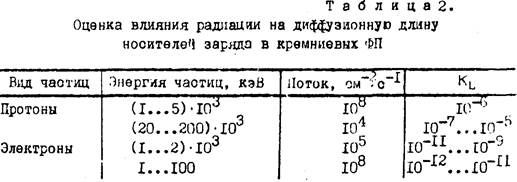 где L0 –диффузная длина в исходном материале, KL = Кτ / D, где D –коэффициент диффузии, не зависящий от облучения. Значения , KL для протонов и электронов различных энергий приведены в таблице 2.[3]