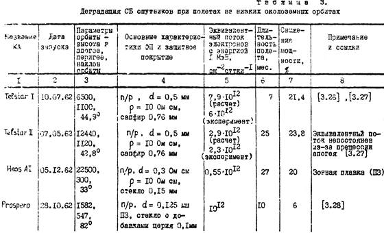 Результат исследования деградации СБ спутников, летающих на низких орбитах, приведены в таблице 3. Установлено, что деградация СБ спутников «Телстар1» и «Телстар2» в основном вызывалось протонами радиационных поясов. На спутнике «NEOS A1» радиация за 800 суток полета составила 3,5%, что предписывается не к «фотонной» деградации. Спутник, NTS-1, открывающий серию запускаемых на орбиты, близкие к круговым, под разными углами к плоскости экватора, имел СБ, деградация которой оказалась на много выше расчетной. При этом наиболее заметно снизилась мощность фотоприемника из лития, что не получило однозначного объяснения. Предполагают, что характеристики могли ухудшиться в следствие диффузии лития через p-n-переход либо вследствие перегрева панели с ФП, либо из-за нарушения контактов. Сильную деградацию отмечали и в «фиолетовых» ФП с неглубоким переходом, но их абсолютная мощность оставалась по-прежнему выше абсолютной мощности обычных ФП. Так на 753 сутки полета максимальная мощность фиолетовых ФП составляла 47…50 мВт, а обычных ФП только 39,1 мВт.
