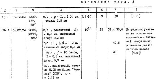 Исследования, проведенные в наземных условиях, показали, что под влиянием УФ-излучения прозрачность этих стекол вначале быстро снижается (примерно на 10%) , оставаясь после этого почти без изменений. За тем она медленно снижается до уровня, при котором стекло становится непригодным для работы. Это связано с окрашиванием стекол под влиянием излучения длинной волны 530мкм. Установлена эквивалентность воздействия УФ-излучения и быстрых электронов на стекло. УФ-излучение приводит также к потемнению клеящего состава, соединяющего защитные стекла с ФП.
