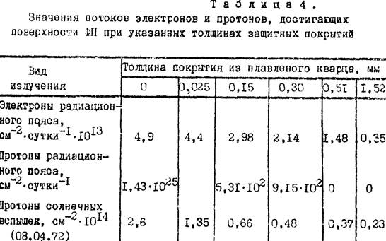 При расчетах радиационной обстановки на геостационарной орбите действие излучения на СБ обычно учитывают влиянием протонов и электронов радиационных поясов, а так же космических лучей. Значение потоков электронов с энергией 1 МэВ, эквивалентных потокам электронов и протонов, действующих на кремний p-типа проводимости, приведены в таблице 4. В ней же указаны величины потоков, достигающих поверхности ФП при использовании покрытий из плавленого кварца различной толщены.