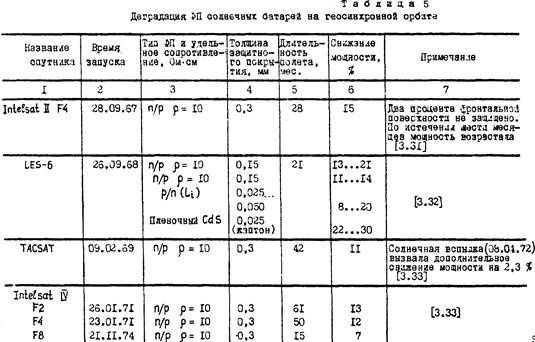 Доминирующее значение на ГCO имеют электронные потоки. Велики также потоки протонов малых энергий. Заметное влияние могут оказать и протоны солнечных вспышек. Некоторые экспериментальные данные о деградации СБ различных КА, запущенных на геостационарную орбиту, приведены в таблице 5. Во время полетов на ГСО были впервые обнаружены оптическая деградация покрытий и воздействие протонов низких энергий. На спутниках серии IDSCS потемнение защитных покрытий толщиной 0,5мм привело к дополнительному снижению тока СБ на 9±3% за пять лет полета.
