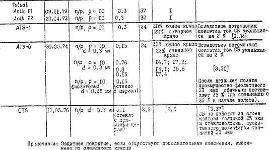 Уменьшение прозрачности защитных покрытий снижает выходные параметры CБ. Так, на спутниках связи IDSCS в результате этого явления дополнительное снижение тока СБ за пять лет полета составило 9±3%. Потери мощности ФП на одном из спутников серии IDSCS (США), в течении 5 лет летавшего на высоте 20000км, равны 3…9%. Наблюдалась деградация «фиолетовых» фотопреобразователей спутника на 2,3…2,6%.