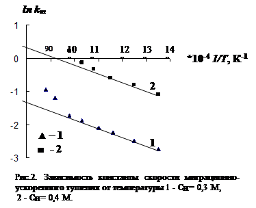 Опираясь на полученные экспериментальные данные можно отметить, что на начальном участке при концентрации 0.3 М в области от 77 до 102 К точки хорошо укладываются на экспоненту (прямая линия). Для концентрации 0.4 М - эта область от 77 до 95 К. Таким образом, можно сделать вывод, что причиной увеличения константы скорости мигационно-ускоренного тушения в этой области является активационный процесс. Энергия активации данного процесса ЕА , вычисленная из рис.2, для обеих концентраций составляет 220 см-1 , что в пределах ошибки измерений совпадает с полушириной 0-0 полосы спектра фосфоресценции нафталина (250 см-1 ).