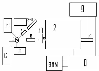 1 - образец в криостате, 2 - монохроматор МДР -23, 3-4 блок питания источника фотовозбуждения, 5-6- блоки оптических фильтров с конденсорами, 7 - ФЭУ, 8 - блок управления и регистрации сигнала, 9 - усилитель (UNIPAN 232B), 10 - модулятор, 11-блок регистрации температуры, 12 -блок электропитания образца, 13 - вакуумный пост.