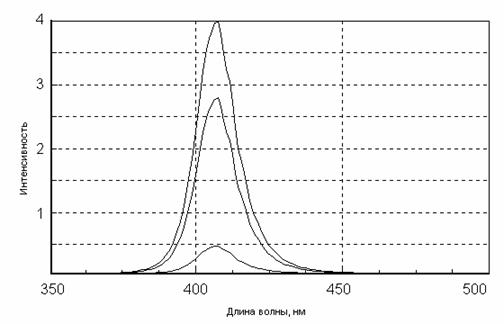 Рис. 3,а. Спектры излучения (ЭЛ) «фиолетового» светодиода при Т=300 К в зависимости от величины тока I , mA : 4.1 ; 11.9; 15.2.