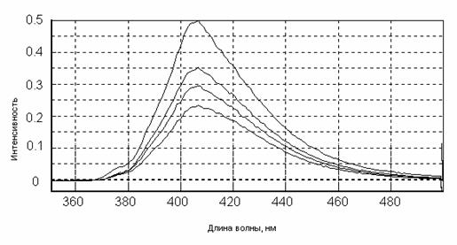 Рис. 3, б. Спектр излучения (ЭЛ) «фиолетового» светодиода при Т=90 К в зависимости от величины тока I mA : 2.76; 4.53; 6.7; 15.8