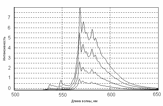 Рис. 4, б. Спектр излучения (ЭЛ) «желтого» светодиода при Т=90 К в зависимости от величины тока I mA : 0.23; 1.0; 2.15; 3.7