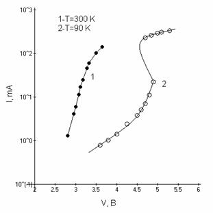 Понижение температуры проводит к тому, что в силу уменьшения энергии термической ионизации, в квантовых ямах инжектированные носители заряда заполняют не только нижние, но и верхние квантовые уровни. Идет накопление электрического заряда в квантовых ямах, что сопровождается ростом внутреннего электрического поля в гетероструктуре. Когда величина поля достигает критического значения, наступает туннельный «пробой», что сопровождается шнурованием тока (S-образная ВАХ на рис. 5) и резким увеличением интенсивности излучения (рис. 6).