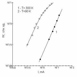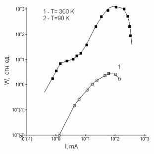 «Желтые» светодиоды изготавливаются из p-n-гомоструктур на основе фосфида галлия (рис. 12). Основным механизмом излучательной рекомбинации в них является экситонный [3]. Спектры излучения экситонов состоят из серии узких полос. Вследствие температурного уширения спектральных полос при Т=300 К спектр излучения «желтого» светодиода состоит из одной полосы со слабо выраженной структурой (рис. 4,а). При понижении температуры от 300 до 90 К температурное уширение спектральных линий постепенно «снимается» и при 90 К начинает полностью проявляться квазидискретный спектр экситонной люминесценции (рис. 4,б). Интенсивность этой люминесценции будет определяться концентрацией связанных электронно-дырочных пар, которая в свою очередь зависит от концентрации инжектированных носителей заряда (рис. 7, 8).