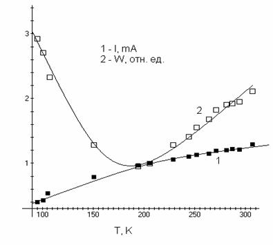 Рис. 10. Температурные зависимости тока «желтого» светодиода и интенсивности его излучения