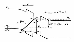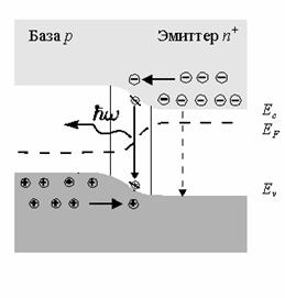 Рис. 12. Энергетическая диаграмма p - n + - структуры на основе GaP . Стрелкой показан переход электронов при аннигиляции экситонов с излучением кванта света