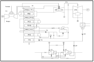 Рисунок 1. Схема ПГТ: ГТУ - газотурбинная установка; ЭГ - электрогенератор; КУ - котёл-утилизатор; ПЕ - пароперегреватель; ИС - испаритель; ЭК - экономайзер; ГПК - газовый подогреватель конденсата; ВД - высокое давление; СД - среднее давление; НД - низкое давление; ПН - питательный насос; РН - насос рециркуляции; Д - деаэратор; ПТУ - паротурбинная установка; ЦВД - цилиндр высокого давления; ЦСД - цилиндр среднего давления; ЦНД - цилиндр низкого давления; К - конденсатор; СП - сетевой подогреватель.
