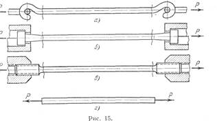 Обычным является растяжение стержня силами, приложенными к его концам. Передача усилий к стержню может быть осуществлена различными способами, как это показано на рис. 15. Во всех случаях, однако, система внешних сил образует равнодействующую Р, направленную вдоль оси стержня. Поэтому независимо от условий крепления растянутого стержня расчетная схема в рассматриваемых случаях оказывается единой. Она показана на рис. 15, г.