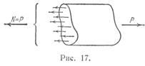 Если воспользоваться методом сечений, то становится очевидным, что во всех поперечных сечениях стержня возникают нормальные силы N, равные силе Р (рис. 16),