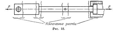 Что при изучении растянутого стержня достаточно принимать во внимание только равнодействующую внешних сил Р, не интересуясь особенностями приложения нагрузки. Для этого надо исключить из рассмотрения часть стержня, расположенную в зоне приложения внеших сил. На рис. 15 это как раз и показано. Отбрасывая части стержня, примыкающие к его концам, получаем единую расчетную схему (рис. 15, г), независимо от способа приложения внешних сил.