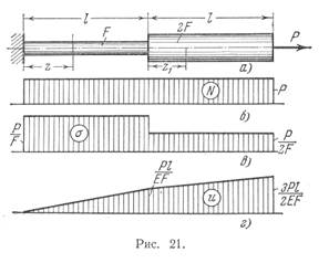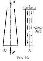 При растяжении, однако, не всегда возникает однородное напряженное состояние. Так, например, у стержня с переменной площадью поперечного сечения (рис. 19, а) напряжения меняются по длине и напряженное состояние не однородно. То же самое имеет место и для стержня, нагруженного собственным весом (рис. 19, б).