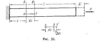 Если бы в стержне (рис. 20) возникало неоднородное напряженное состояние, деформация в сечении А определялась бы путем предельного перехода к малому участку длиной dz и тогда