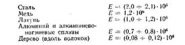 Величина Е представляет собой коэффициент пропорциональности, называемый модулем упругости первого рода. Модуль упругости является физической, константой материала и определяется путем эксперимента. Величина Е измеряется в тех же единицах, что и а, т. е. в кГ/см2. Для наиболее часто применяемых материалов модуль упругости имеет следующие значения в кГ/см2: