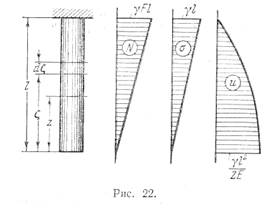 Пример 1.2. Построить эпюры нормальных сил, напряжений и перемещений для свободно подвешенного цилиндрического стержня, нагруженного силами собственного веса (рис. 22). Длина стержня