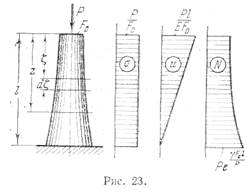 Построение эпюр удобнее всего начинать с эпюры напряжения а, которое вдоль оси колонны по условию не меняется (рис. 23). Поскольку напряжение постоянно, то постоянным будет и относительное удлинение е. Поэтому перемещение и возрастает пропорционально расстоянию от основания колонны.