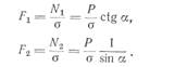 Из условий равновесия узла В (рис. 24) находим нормальные силы в стержнях:
