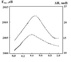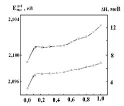 Рис. 2. Концентраційні залежності енергетичного положення основного екситонного максимуму Еекс n=1 та напівширини екситонної смуги ΔН водневого інтеркалата Hx GaSe при T = 77 K.