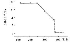 Як видно з рис. 1, у спектрі ПМР інтеркалатів можна виділити «вузьку» й «широку» компоненти, причому необхідно відзначити, що подібні спектри спостерігаються лише в температурному інтервалі 130-370 К, нижче якого зникає «вузька», а вище - «широка» компоненти. Форма «вузької» компоненти, а також її температурний і концентраційний генезис докладно досліджені, тому відзначимо тут лише те, що її поява обумовлена станом впровадженої домішки у вандерваальсовських проміжках структури кристалів. Форма «широкої» компоненти лінії свідчить про те, що за її виникнення відповідально «зв'язане» стан домішки. Другий момент спостережуваної в Hx GaSe лінії становить 27 Гс2 (при кімнатній температурі). Такі значення другого моменту характерні для гідридів перехідних металів, у яких впроваджений водень перебуває в тетраедричних або октаедричних міжвузлях базисної гратки. Подібно гідридам металів при температурі 230 К До на кривій (рис. 2) спостерігається вигин, а при 370 К різке звуження лінії до ширини її «вузької» компоненти. Отже, при електрохімічному інтеркалюванні селеніду галію воднем відбувається не тільки міжвузлове впровадження домішки, але й гідрування шарових вузлів GaSe. Подібно гідридам металів при температурі 230 К відбувається плавне звуження лінії за рахунок включення актиреориєнтації атомів інтеркалянта в шаровому пакеті GaSe (енергія активації Еа =11 ккал/моль). При температурі 370 К відбувається вихід атомів інтеркалянта із шарових вузлів (різке звуження лінії) в об'єм щілини і його інтенсивна деінтеркаляція із кристала). Причому, як показало багаторазове циклювання поблизу температури переходу, процес виходу водню із шарового вузла в міжвузловий простір оборотний (без обліку деінтеркаляції) - при зниженні температури до Т = Tкр знову спостерігається «широка» компонента.