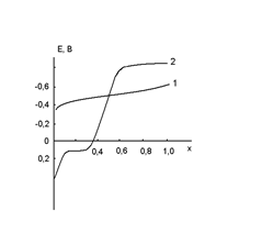 Рисунок 1.3 - Залежність рівноважного електродного потенціалу від складу для сполук Нх InSe (1) та Нх GaSe (2).