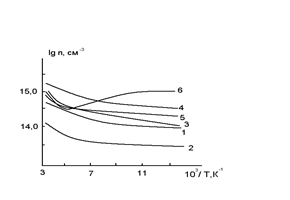Рисунок 1.4 - Температурна залежність n для Нх InSe: 1-х = 0; 2-х = 0,05; 3- х = 0,15; 4-х = 0,35; 5-х = 0,55; 6-х = 0,95.