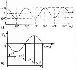 Рис. 2. а) - график скорости центра масс фотона; b) - зависимость изменения силы инерции, действующей на центр масс светового фотона в интервале одного колебания