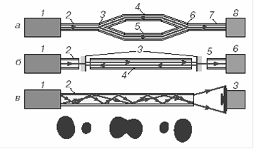 Рис. 2.4. Типи волоконних інтерферометрів: а - інтерферометр Маха-Цендера: 1 - лазер; 2 і 7- підвідний і приймаючий випромінювання світловоди; 3 і 6 - Y-развітлювачі; 4 і 5 - опорний і сигнальний світловоди, 8 - фотоприйомний пристрій; б - інтерферометр Фабрі-Перо: 1 - лазер; 2 і 5 - підвідні і приймаючі випромінювання світловоди; 3 -напівпрозорі дзеркала; 4 - волоконний резонатор, 6- фотоприйомний пристрій; в - багатомодовий інтерферометр: 1 - лазер; 2 - багатомодовый світловод, 3 - фотоприйомний пристрій.