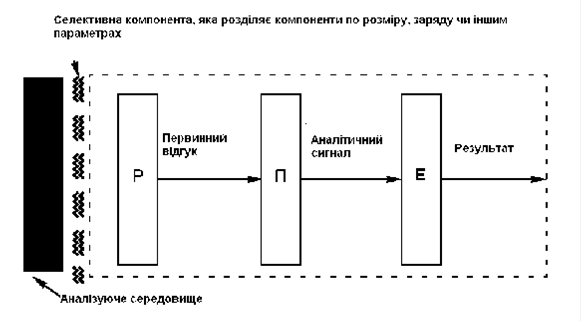 ХС складається з хімічного селективного шару датчика, що дає відгук на присутність обумовленого компонента і зміна його змісту, і фізичного перетворювача (трансдьюсера) [6]. Останній перетворить енергію, що виникає в ході реакції селективного шару з обумовленим компонентом, в електричний або світловий сигнал, що потім вимірюється за допомогою світлочутливого і/або електронного пристрою. Цей сигнал і є аналітичним, оскільки подає пряму інформацію про склад середовища (розчину). ХС можуть працювати на принципах хімічних реакцій, коли аналітичний сигнал виникає внаслідок хімічної взаємодії обумовленого компонента з чуттєвим шаром, або на фізичних принципах, коли виміряється фізичний параметр (поглинання або відображення світла, маса, провідність). У першому випадку чуттєвий шар виконує функцію хімічного перетворювача. Загальна схема функціонування ХС зображена на рис. 3.1.