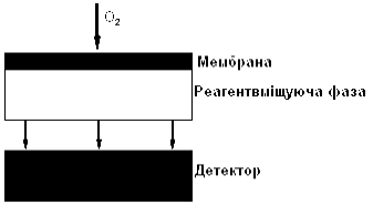Необоротні оптроди через витрату РВФ мають обмежений термін служби. Однак його можна продовжити заміною РСФ на нову фазу. Стабільний сигнал від цих ВОС може бути отриманий лише в умовах стаціонарного масопереноса визначаємого компонента в зону його взаємодії з РВФ. Будь-яка перешкода, що порушує масоперенос, дає помилку в показаннях ВОС. На рис.3.3 показана схема роботи необоротного оптрода на кисень.