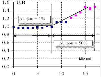 Дослідження довгострокової стабільності сенсорних властивостей полімеру (16 місяців) (рис.3.8) показало стабільність роботи в плині перших 8 місяців (дрейф фонового сигналу (U0 - початкове значення фотовідгуку на повітрі) = 1%) [6]. Протягом наступних 8 місяців спостерігався ріст значення фотовідгуку сенсора на 50%, зв'язаний з поступовим знебарвленням барвника, що приводить до просвітління чуттєвої плівки ПДМС.