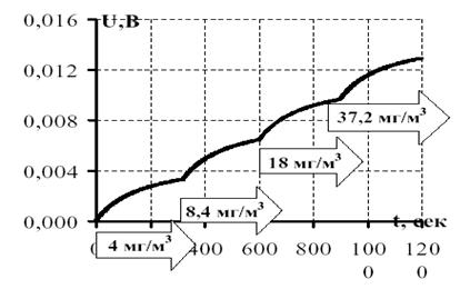Отримано кінетичну криву зміни відгуку сенсора при напуску аміачно-повітряної суміші в діапазоні концентрацій 0,48 - 2.13 мг/м (мал.3.12) [6], на підставі якої побудований градуюровочний графік (мал.3.13) і розрахова межа виявлення аміаку сенсором Про = 0.02 мг/м3 в атмосферному повітрі, що говорить про можливості застосування сенсора для контролю аміаку у повітрі населених областей.