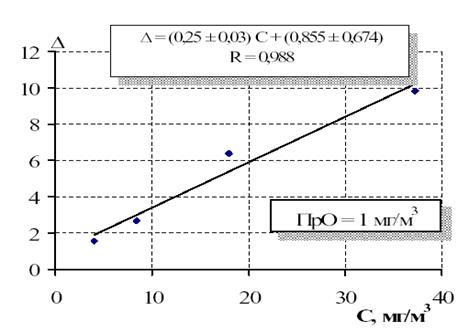 На основі кінетичної кривої (рис.3.9) був побудований градуюровочний графік сенсора на аміак у діапазоні концентрацій 4-37 мг/м3 (рис.3.10) і розрахована межа виявлення, яка склала 1 мг/м.
