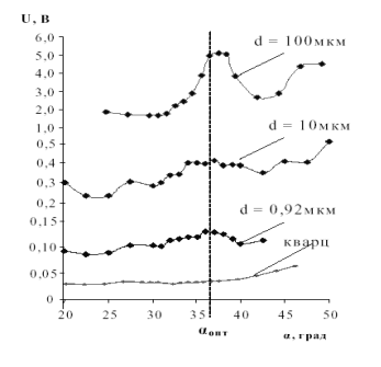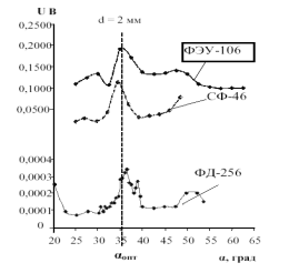 Визначений оптимальний кут введення світла в зразок, що відповідає максимумові інтенсивності вихідного з хвилеводу світла і рівний 360 , причому як для різних фотоприймачів (дослідження проводилися на ФЕП-106, ФД-256 і фотоприймачі СФ-46) (рис.3.10), так і для різних товщин хвилеводів (рис.3.11).