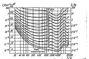 Уровень громкости звука любой частоты равен уровню громкости чистого тона с частотой 1000 Гц, ощущаемого с такой же громкостью, выраженному в Дб. Единицу громкости называют фон. 1 фон равен 1 Дб на частоте 1000 Гц.