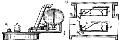 Основным элементом газовой защиты является газовое реле KSG, устанавливаемое в маслопроводе между баком и расширителем (рис. 6, а). Ранее выпускалось поплавковое газовое реле ПГ-22. Более совершенно реле РГЧЗ-66 с чашкообразными элементами 1 и 2 (рис. 6, б).