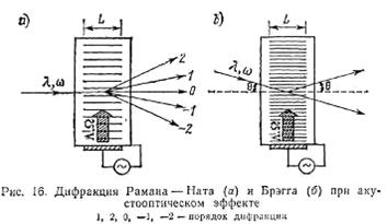 Акустооптический эффект - это явления дифракции, преломления, отражения или рассеяния света на периодических неоднородностях среды (зонах с разным показателем преломления), вызванных упругими деформациями при прохождении ультразвука. Периодическое чередование неоднородностей среды «работает» как дифракционная решетка, изменяющая направление светового луча. Акустооптические эффекты бывают двух видов (рис. 16). При низкой частоте ультразвука и малой ширине фронта (длине взаимодействия) ультразвуковой волны возникает дифракция Рамана - Ната. А если частота ультразвука высока и длина взаимодействия велика, то происходит дифракция Брэгга.