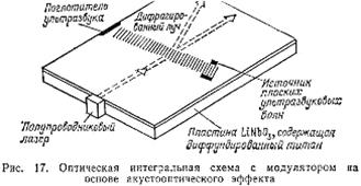 На рис. 17 показан пример размещения акустооптйческого прибора внутри оптической интегральной схемы. Здесь поверхностной ультразвуковой волной модулируется свет в оптическом волноводе.