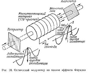 = VHlКоэффициент пропорциональности Vназывают постоянной Верде. В приборах на основе магнитооптического эффекта используют материалы с высокими значениями постоянной Верде. На рис. 18 показано прохождение света через прозрачный магнитооптический материал. Если поляризатор на входе и анализатор на выходе показанного прибора расположены взаимно перпендикулярно, то проходящий свет можно модулировать, изменяя угол Фарадея, зависящий от напряженности магнитного поля. Однако так как быстрое изменение магнитного поля затруднено, то для модуляции света больше подходит электрооптический и акустооптический эффект.
