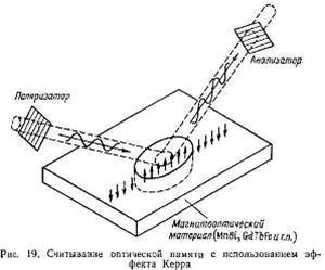 Магнитооптический эффект Керра с успехом применяют для считывания информации из памяти на оптических дисках, позволяющих перезапись, и памяти на цилиндрических магнитных доменах, имеющей высокую плотность (рис. 19).
