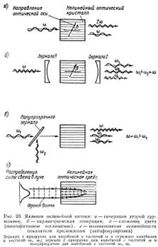 параметрического излучения (рис. 20,б). Оптическое смешение - это явление с эффектом, обратным предыдущему. Здесь при облучении с двумя частотами