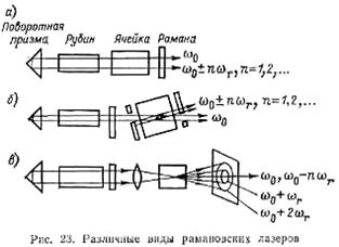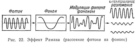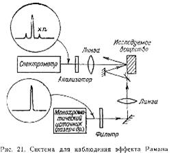 Эффектом Рамана (рис. 21) называют рассеяние монохроматического излучения в веществе, При котором в спектре рассеянного света появляются новые, характерные для данного вещества линии, отличающиеся от спектральной линии источника. Это явление впервые в 1928 г. обнаружил индийский физик Раман. Если направлять на вещество сильный когерентный свет, например свет лазера, то наблюдается сильное рамановское рассеяние с выраженной направленностью. Это явление, названное вынужденным рамановским рассеянием, впервые обнаружил Вудбьюри (Woodbury) в 1962 г. Явление, открытое Раманом, в отличие от вынужденного рамановского рассеяния стали называть естественным римановским рассеянием.