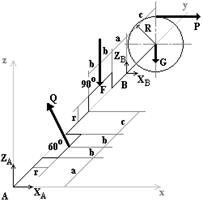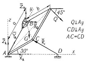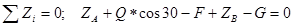 3) ∑FKZ =ZA +ZB +RC ·sin30°-G-Q·cos45°=0;